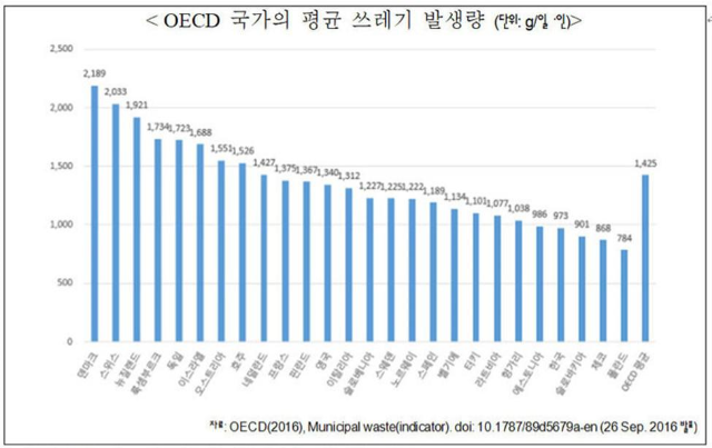 보시는 것처럼 같은 OECD에 속한 국가들과 비교할 때, 우리 나라의 1인당 쓰레기 배출량은 여전히 낮은 편이며, 동시에 재활용률은