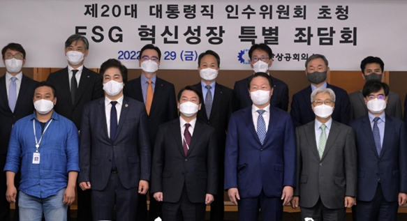 새로운 정부 출범을 앞두고 있는 5월 초 이 시점의 대한민국에서도 ESG에 대한 중요성과 관심은 점점 더 커지고 있는데요, 윤석열 정부 대통령직인수위원회에서도 여러 위원들이 ESG와 관련된 사항을 다루고 있는 것으로 알려져 있습니다. 윤석열 당선인의 새 정부는 대통령 직속 가칭 ‘ESG 위원회’를 만들 것이라고 하고요, 안철수 인수위원장은 대한민국 기업 집단을 대표하는 최태원 대한상의 회장 등을 초청해 ‘ESG 혁신성장 특별좌담회’를 가졌다고 했는데요, 여기에는 10대 그룹 사장단과 금융권 대표 등이 참석했다고 합니다.