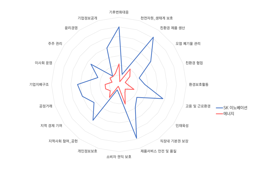 - 에너지 산업군 전체의 ESG 수준도 낮다고 할 수 없으나, SK이노베이션은 E, S, G 모든 영역에서 한 등급씩 높게 나타났습니다. 또한 각각의 세부 항목 모두에서도 전체 에너지 기업군 대비 적어도 같거나 한 단계씩 높은 등급의 결과를 보입니다.