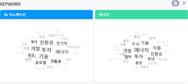 - 주요/핵심 키워드에서도, 기업의 핵심 정체성인 에너지보다도, ‘친환경’, ‘투자’, ‘기술’이 중심 키워드가 되고 있습니다. 조금 더 친환경적이고 높은 품질의 제품과 서비스, 그리고 지역 사회 공헌을 보다 적극적으로(잘) 커뮤니케이션한 결과라고 해석 가능합니다.