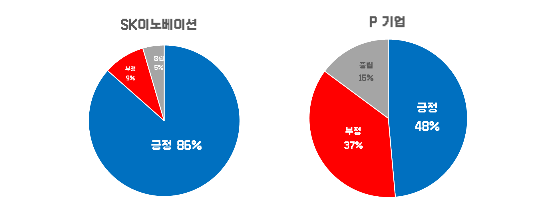 - P.ESG를 통한 1년간 조회 결과, SK이노베이션으로 잡히는 전체 데이터 수는 10만 개에 가까우며, 여기에 긍정으로 판별된 것이 무려 86% 비율입니다. 반면 같은 산업 섹터에 있는 P기업의 경우 1,500개에 긍정은 48% 였습니다. 물론, SK이노베이션의 시가총액과 매출이 P기업에 비해 2배 수준이고, 다수의 자회사를 가지고 있다는 점에서 차이는 있습니다. 하지만, 40배가량의 ESG 활동 데이터는 물론 압도적 수준의 긍정 판별을 가지고 있다는 것은 주목할 점입니다. 아래의 원 그래프가 동일한 크기로 그려지기는 했지만, 보다 실감나는 비교를 위해서는 SK이노베이션의 파이(원 그래프) 크기가 P기업의 그것보다 40배 정도 크게 그려져야 합니다.