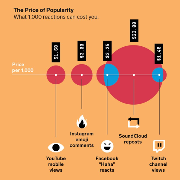 매월 팔로워를 유지시켜주는 에이전트 비용이 1천달러에서 2만달러, 한화 약 100만원에서 2천만원, 그리고 유튜브, 인스타그램, 페이스북, 사운드클라우드, 트위치에서 각각의 반응(reactions)을 1,000회 얻는데 드는 비용은 다음과 같다네요.
