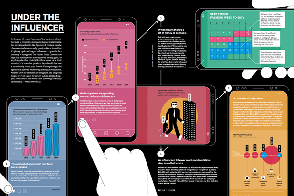 지난 15개월간의 페이스북 변화를 표제로 다루고 있는 이번 와이어드 최신호에서 피알워너의 눈길을 끈 것 중 하나는 ‘인플루언서의 이면(UNDER THE INFLUENCER)’이라는 제목의 양면 그래픽 기사 입니다.