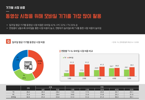 이제 10대부터 50대까지 모든 연령에서 모바일 기기를 통한 동영상 시청 비중이 TV를 넘어섰으며,